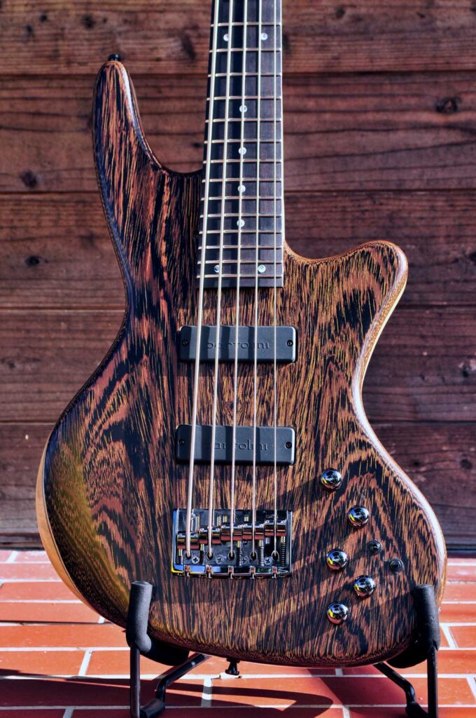 PUの位置はフェンダーのジャズベースの位置に合わせてあるので、コイルタップでシングルにするとジャズベース的な音も可能。
